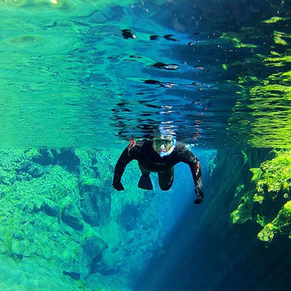 大裂缝浮潜是冰岛的旅行户外项目中最独特的一项了,在辛格维利尔国家公园(Thingvellir National Park)内,有一处清澈见底的长长的湖泊,这里是欧亚板块和美洲板块的交界处。 穿上专业的装备后,会在向导的带领下跳下湖里。当带上潜水镜,你会被眼前的景象震撼,连绵起伏的山峰,形态各异的岩壁,简直就是另一个世界,甚至让你觉察不到这是在水下。Iceland Adventure Tours提供的大裂缝浮潜向导相当专业,游客们可以放心的参与此项目。