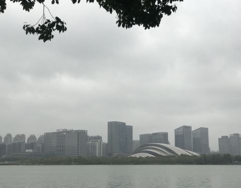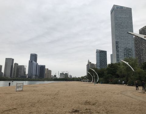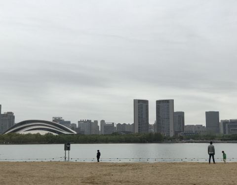 今天走到天鹅湖体育公园的另外一边,看看天鹅湖,大剧院和市政中心,湖边有一个人造沙滩,方便孩子玩耍,天气有点转凉了,只有一对父子在那里玩。
