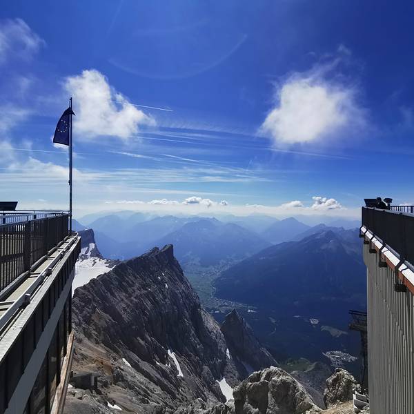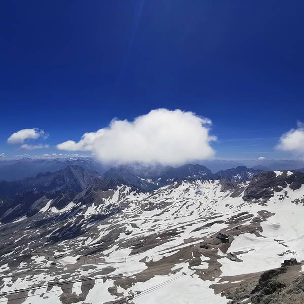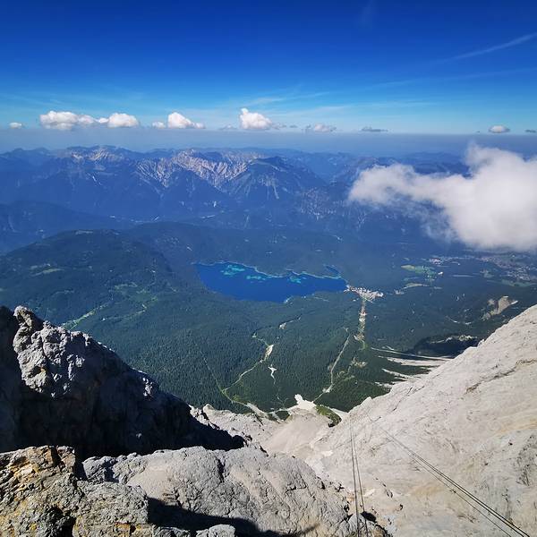 乘坐登山火车可以到达艾比湖Eibsee, 可以在这里游玩一阵然后再换乘缆车到山顶,但是我们时间颇为仓促就跳过艾比湖了,登山火车到达海拔2650的终点站后换乘山顶缆车Gletscherbahn去山顶。山顶餐厅眺望台在山顶餐厅望着这一片辽阔的山脉,喝上一杯德国啤酒真的别有风味 🍺蓝色的那一块就是艾比湖啦~ 展开