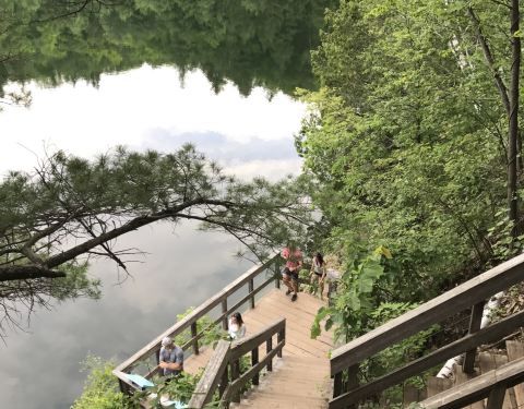 品克湖(pink lake) 品克湖位于渥太华西北的加蒂诺公园,距渥太华市中心也只有半小时车程。 品克湖,听名字以为是粉色的湖泊,但是身临其境,才发现没有任何粉色,却是一片美丽的、绿松石色的、如水晶般清澈的湖泊,就像是沉睡的少女,柔美、安静……。因为湖面并不大,绕一圈(全程约2.5公里)也不需要很多时间,这里一年四季景色不同,尤其是因湖中倒影形成的美景,使得在这里休闲散步是一个极其快乐的过程。