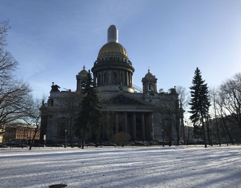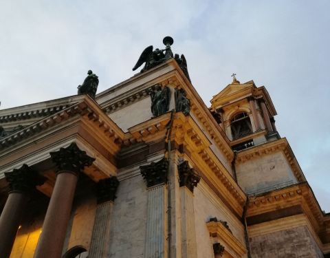 圣以撒大教堂,又名伊萨基辅大教堂是俄罗斯北方大的教堂,整座教堂建筑造型雄浑壮观,被视为俄罗斯晚期古典主义建筑的杰出作品,是世界四大教堂之一。这座教堂约100米的海拔相当于30层楼房的高度,即使在远处也能看到其金光闪闪的“洋葱头”圆顶,整个教堂的空间可同时容纳近1.2万人,将东正教教堂的雄伟宏大的建筑风格诠释得淋漓尽致。教堂的四面各有10多根巨大的石柱,每根石柱重达120吨,成双排托起雕花的山墙。教堂外墙用灰色大理石贴面,内部使用了有色大理石、孔雀石、青金石等名贵矿物进行装饰,仅装饰用的黄金就达410公斤,包括用于穹顶外部镀金的约100公斤。自1858年建成后,这座教堂至今再没有重新镀金,但穹顶光彩夺目的姿态依然足以令游人叹为观止。教堂在二次世界大战中遭到严重破坏,战后用了20余年才修复为今天的面貌。在光洁的花岗岩石柱上,仍可以看到弹痕累累的印迹,这些印迹在修复工程中没有进行修补,目的是告诫后人不要忘记过去的历史。