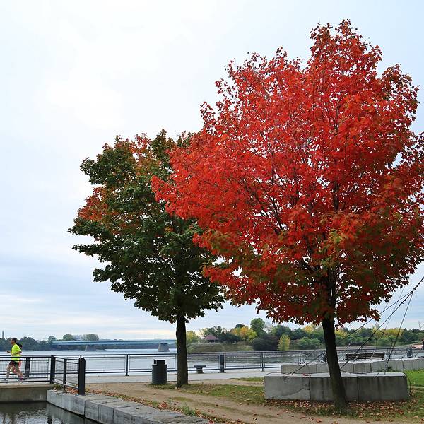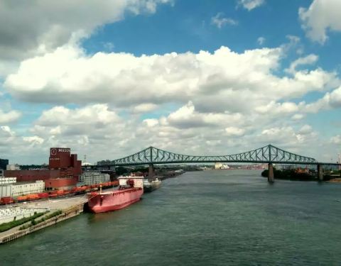 从酒店往南走就是老港,隔着码头是地标钟楼,钟楼(Tour de l'Horloge)坐落在加拿大蒙特利尔市Quai de l'Horloge(也曾被称为维多利亚角),是蒙特利尔老港口的一部分。这座钟楼也叫做水手纪念钟楼(The Sailors' Memorial Clock),曾被用以纪念第一次世界大战阵亡的加拿大水手。现在这座面向圣劳伦斯河的钟楼成为观赏城市和圣劳伦斯河的绝佳景点之一。顺着码头走,到达圣母圣心礼拜堂的后面。沿着码头的路,可以一直走到钟楼下,早晨很多人在跑步,水鸟也安详的踱着步。沿着圣劳伦斯河往前走。蒙特利尔整体的枫树都没有变颜色,但是河边还是出现了一棵红了枫树。