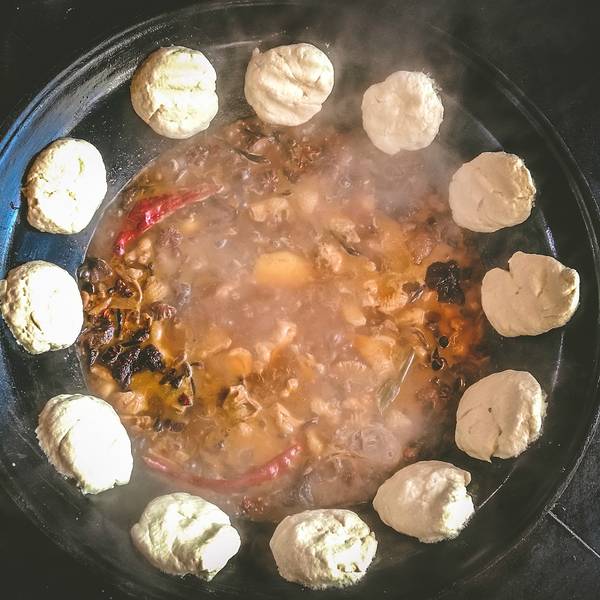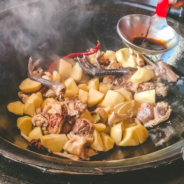 小鸡儿炖蘑菇,各种食材配上酱料不断翻炒,香气四溢,让人口水直流