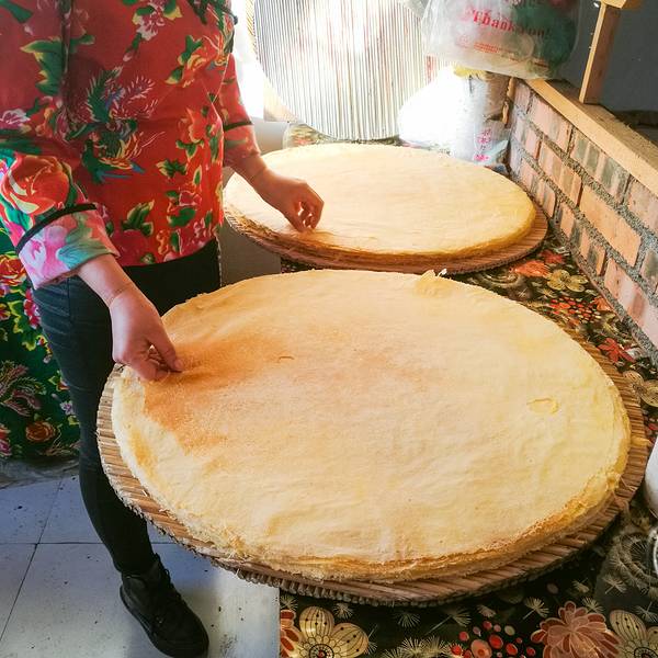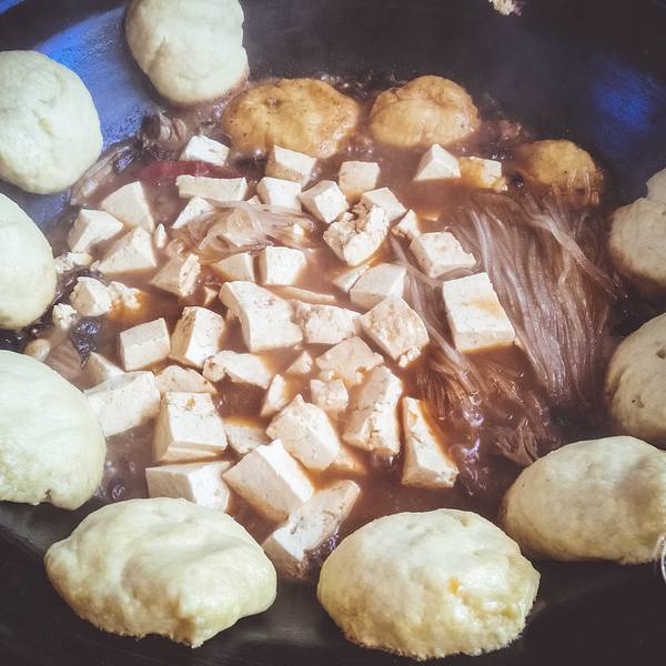 进入饭店,炕头带来的暖暖热意迎面而来,那叫一个舒坦。 饭店内满是花花绿绿的东北元素装饰,朴实、大方、有滋有味。不乏一些过去东北人家里才有的有趣玩意儿,小东西见大风俗。服务员们都是红绿棉袄的装扮,非常醒目,一个个招呼起来也是热情奔放,麻利干练。这家必吃的是东北铁锅炖,我们围着一圈啥都不用干,嗑瓜子就行,服务员一个人包揽了全部活,也是厉害。小鸡儿炖蘑菇,各种食材配上酱料不断翻炒,香气四溢,让人口水直流。大锅再贴上一圈玉米面饼子,盖上锅盖焖一段时间。等再掀开锅盖的时候,一大锅炖菜已经准备就绪! 吃铁锅炖就图个热闹气氛,一大锅有肉、有菜、有粗粮,一家人围着吃贼过瘾!玉米面饼子也是真香,浸足了炖菜的汤汁,成为父母的最爱。离开前,四丫头们根本没闲着,又开始忙活着做煎饼。