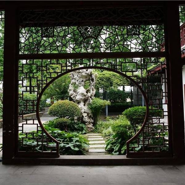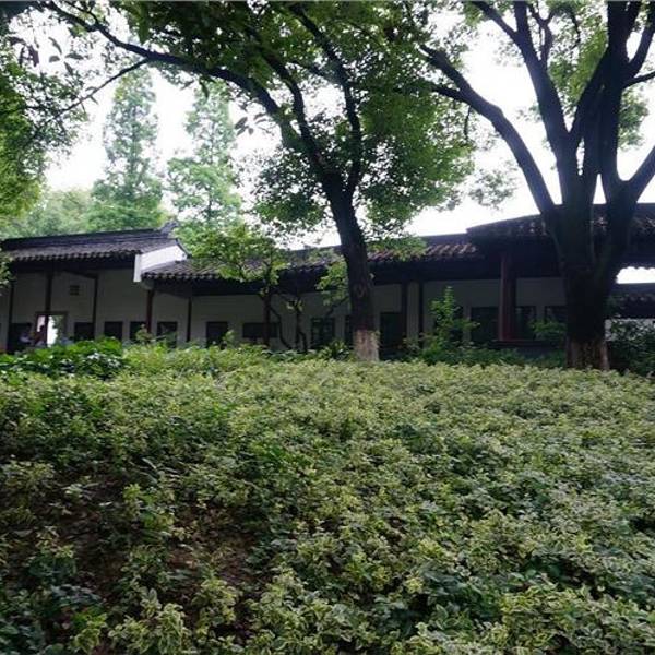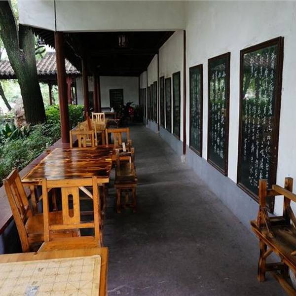 回廊掩映在大树下,郁郁葱葱,夏天非常凉爽。里面的建筑是仿古典的。从粉墙黛瓦的门进入,就是遂园了