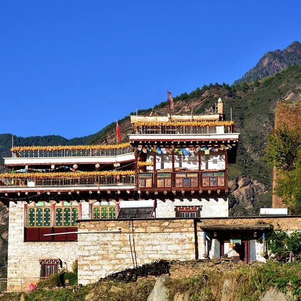传说当地谁家生了男孩,便要修筑高碉,同时还要炼一坨铁埋在地里。碉曾是家庭力量的体现大小金川两条河流在丹巴县城汇入大渡河,中路藏寨就在大渡河旁边的一座山梁上。从这里隔河望去就是藏区四大神山之一的墨尔多神山。嘉绒藏族就是泛指这座海拔4280米大山周围16万平方公里的地域。丹巴碉楼堪称一绝...大小金川两条河流在丹巴县城汇入大渡河,中路藏寨就在大渡河旁边的一座山梁上。从这里隔河望去就是藏区四大神山之一的墨尔多神山。嘉绒藏族就是泛指这座海拔4280米大山周围16万平方公里的地域。丹巴碉楼堪称一绝,这当中又以中路藏寨为甚。在峡谷里,在山坳处、村庄里,处处都是30米至50米的碉楼。它们用石片砌成,有四角、六角、八角等。站在碉楼下,可见碉楼如刀锋,墙体光滑,上面留有射击孔和瞭望口,不少碉楼周身布满青苔,野草丛生。除了部落战争和冤家械斗外,吐蕃东扩、唐朝对西南的战争等,都促进当地居民修这些防御性堡垒。传说当地谁家生了男孩,便要修筑高碉,同时还要炼一坨铁埋在地里。孩子每长一岁,修一层碉,还要把铁从地里挖出来在冶炼一番。孩子18岁时碉已修到18层,铁也练成钢刀,这时便要给孩子举行成人仪式,并把钢刀赐予男孩。碉曾是家庭力量的体现。 展开