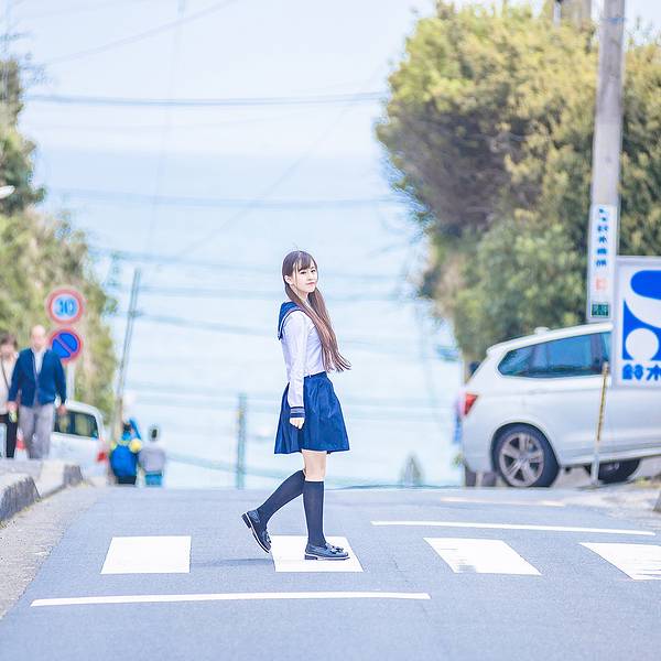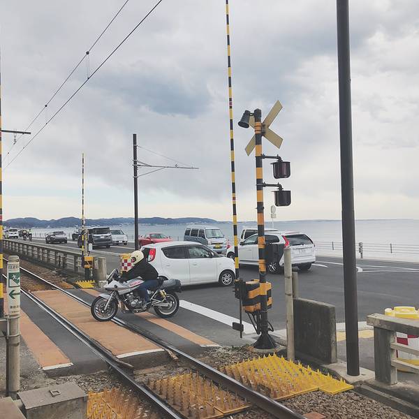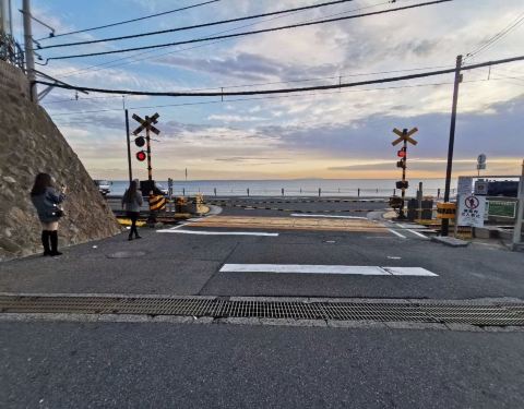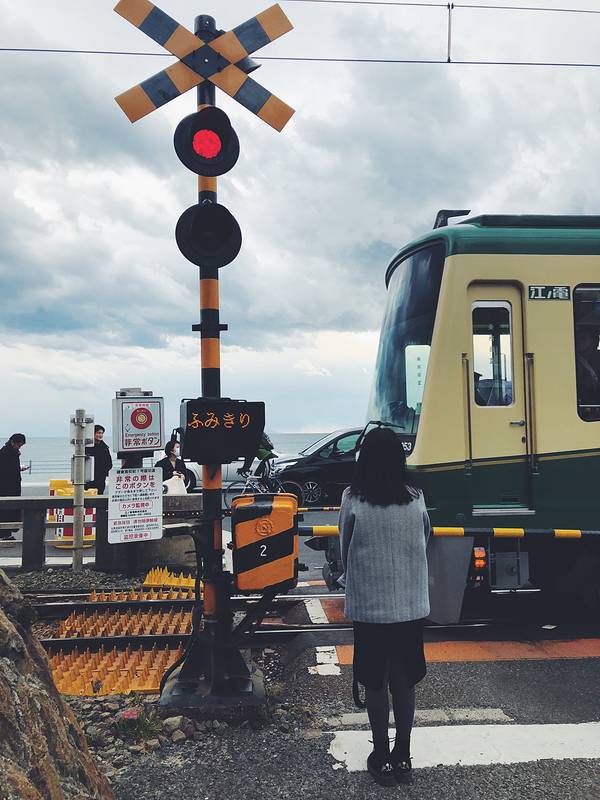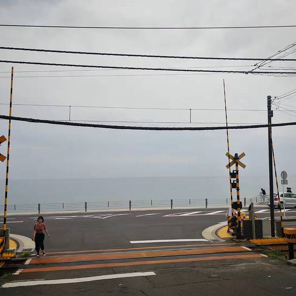 沿路看到很多朝圣者,在狂风中痴痴地看着这路口的画面,那些闪光的记忆都如同这海风般猛烈翻涌,多少人在路口守候电车缓缓驶过的瞬间,只为拍一张记忆里的照片,隔着车道就是湛蓝的七里滨和湘南海岸的景色,为静默的时光提供最美的背景。