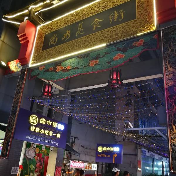 虽说决定出行只在一瞬间,但还好之前看过相关攻略,所以行程安排倒是没啥问题,就是订酒店比较要紧,但是这一路上邓童鞋的手机在导航,我的手机不知何故老是信号弱,特别是到了广西地段直接就没信号了,所以酒店是下午四点多,快到达桂林市时才在网上定的,由于比较着急,也没仔细看,到了才知道酒店位置有点偏,以至于我们当时怀疑到了一个假桂林 不过,既来之则安之,这个一点不影响我们的出游心情,酒店安顿好,我俩直奔尚水美食街找吃的,尚水美食街就在正阳步行街附近,来自全国各地的小吃都有,价格也不贵,一般都在10元一份的样子!小吃味道还行,不过这里的桂林米粉味道一般,后来几天吃的桂林米粉都比这里的好吃!