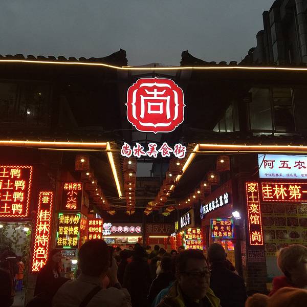 到了晚饭的时间,我们来到了桂林的尚水美食街。在这里,我们看到了各地的美食,这是在继芦笛岩之后,让我跟男票又一次眼花缭乱,目不暇接的地方。