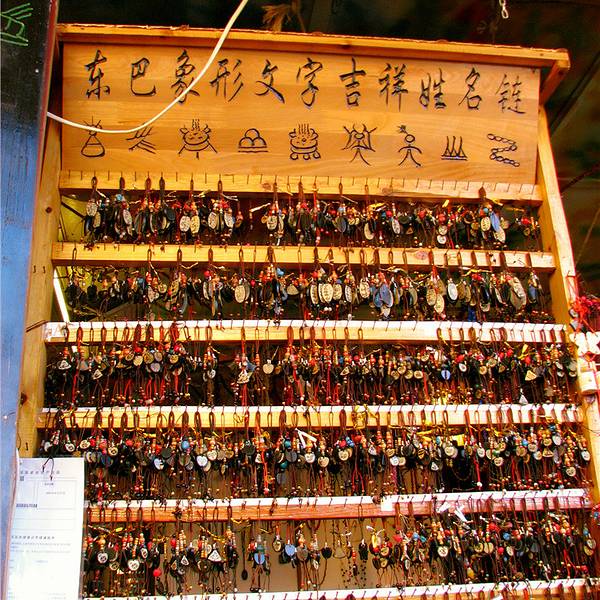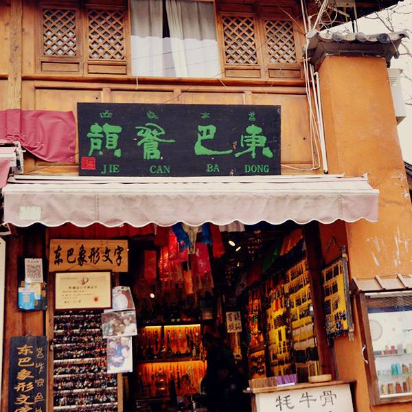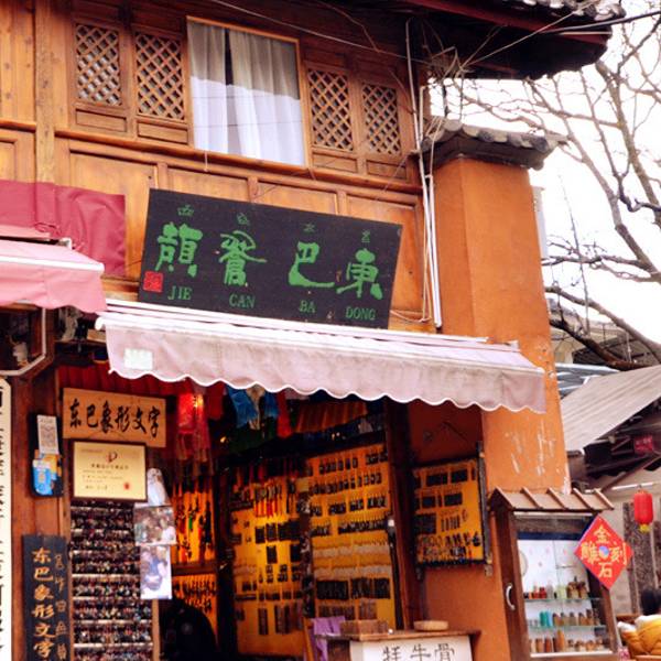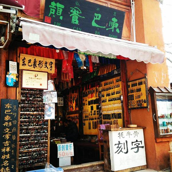 店里民族文化气息很浓,卖的是极富地方特色和独特个性的东巴挂件,店主人自己设计,手工制作。品种很多,大部分是木头刻字,也有牦牛骨和金石刻字,刻的当然是东巴象形文字,刻好的字再喷上各种颜色。多以东巴文化、文字为题材,色彩或庄重或艳丽,做工精细,线条流畅,刻画生动,有的作品直接以东巴文字和神灵来呈现,有较高的艺术欣赏价值和收藏纪念价值,和地摊货完全不同,主料和配料的选择都相当的用心。