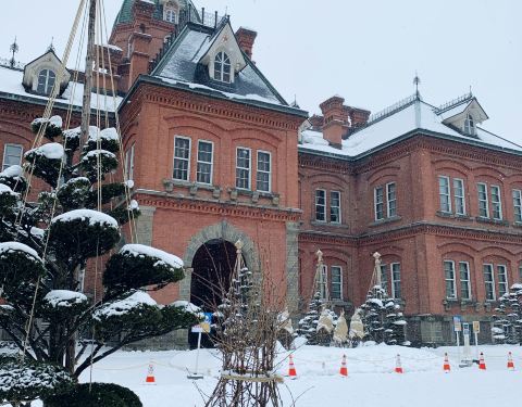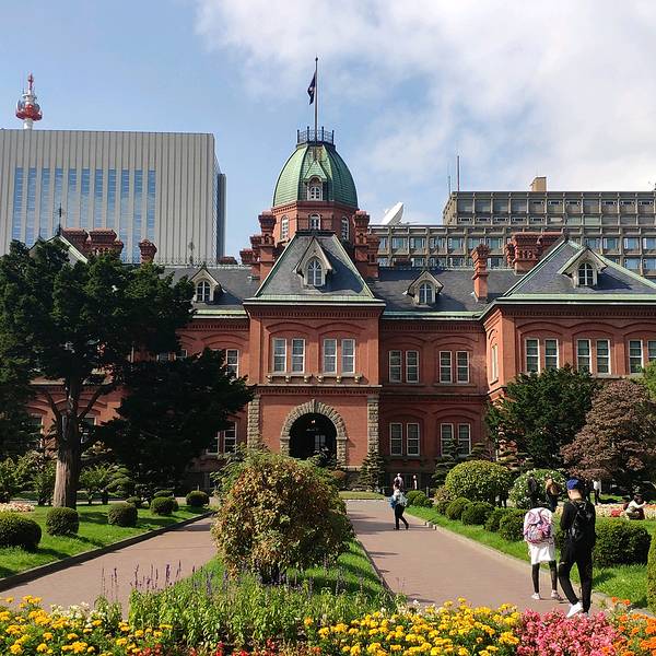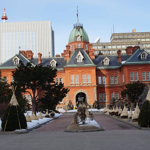 位于札幌市中心的北海道厅旧本厅舍原本是北海道的很高行政机关大楼,建于1888年。这座红砖绿瓦的巴洛克风格建筑是北海道开拓时代的象征,被当地人亲切地称为“红砖房”( 赤レンガ),也是札幌的一大地标性景观。 优雅的前庭 北海道厅旧本厅舍的前庭里有花坛、池塘及古树,是当地市民散步休闲的好去处。夏季时这里鲜花盛开,绿树成荫,红砖墙在阳光的照耀下显得格外耀眼。而到了冬季,屋顶、地面及树木都被白雪覆盖。入夜后这里还会点亮灯光,也别有一番风味。 欣赏旧道厅外观 北海道厅旧本厅舍正面上方有一颗红色五角星装饰,是北海道开拓的象征,屋顶上还矗立着绿色的八角塔,是当时流行的西洋风情的体现。站在旧道厅正前方仰望,其后方右边的高楼则是现在的北海道厅。 参观旧道厅内部 目前,北海道厅旧本厅舍内设有北海道立文书馆、北海道历史画廊等。馆内基本保持着过去的风貌,你可以在这里看到许多关于北海道开发历史的文物资料。