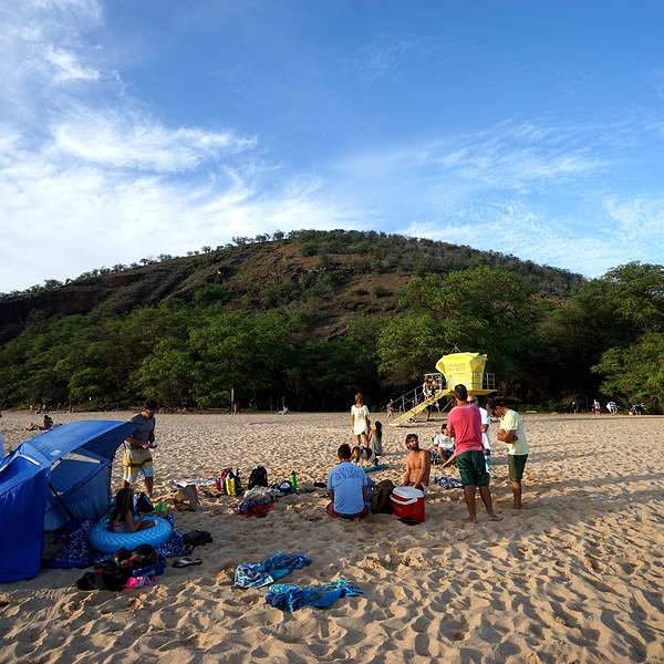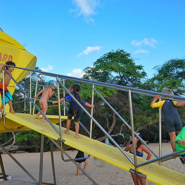 哈哈,其实这确实是在海边啦—— Makena Beach 马克纳海滩 (又称 大海滩)这里本身也是一个州立公园,沙滩旁边就是山体,所以除了海岸线,也有森林风光奇奇怪怪的树根遍地都是因为海岸线很长,所以即使人很多,沙滩上也不会显得非常拥挤,拖家带口的当地人三三两两的享受着悠闲时光下班后的救生亭成了孩子们的大玩具,光溜溜的那个小baby好可爱的当然,比基尼美女也是有的(不过这张显然不是我拍的,你们懂的,我最多偷拍个背影)不过,这里有个比较大的问题就是停车难。停车场目测也有百来个车位吧,不过远远不够,特别是接近日落时分,一位难求,很多人都停在外面马路两侧了。