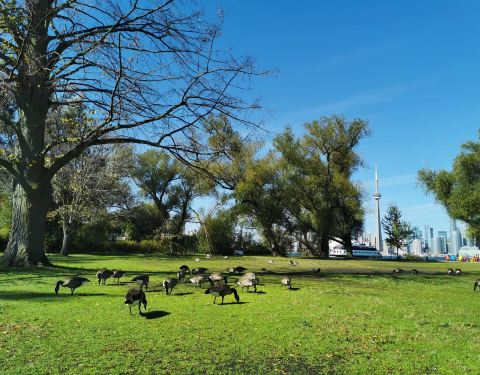 湖心岛位于市中心南端的安大略湖上,岛上景色优美、草坪和枫树等连绵,是远离都市繁琐、休闲亲近自然、赏枫的好地方。岛上不允许机动车通行,可租自行车和小船,有趣的是欢迎踩踏草地(Please walk on the grass!)。在岛上可沿湖边的栈道步行欣赏湖光,也可以在岛内小道步行感受自然。日落黄昏到夜幕降临时一定要到达岛上码头边,是拍摄多伦多经典天际线、远眺多伦多的地标——CN塔的地方。