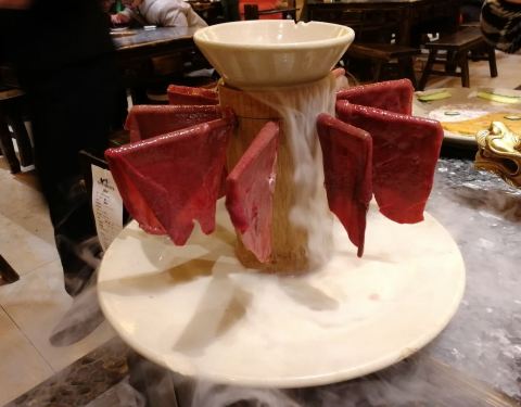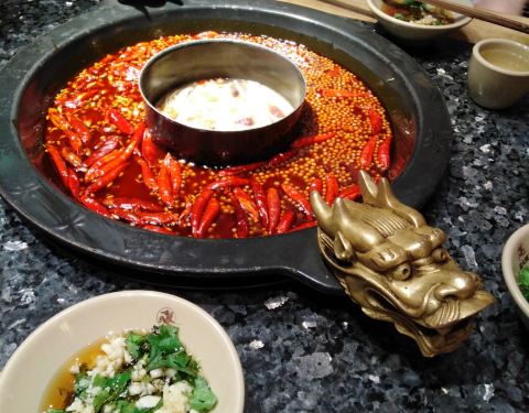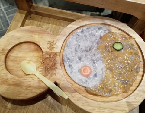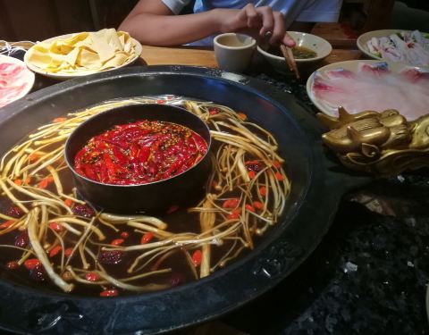 源自成都的品牌,在当地很知名,而且宣传做得好,同时也受外地游客青睐。很普通的一个周日晚上,竟然要等好久的位,还好我们酒店就在不远处,拿了号回去等了一个多小时才收到通知过来。这家分店规模不大,风格复古,果然有种武侠江湖的意味。火锅挺特别,两端是个龙头,霸气。鸳鸯锅中间免辣,四周红汤,这很科学,解决了火候不平衡的问题。上菜的份量不多,但会摆一些造型,弱化了你对食物量的要求。所以价格偏贵,不过口味确实也不错。