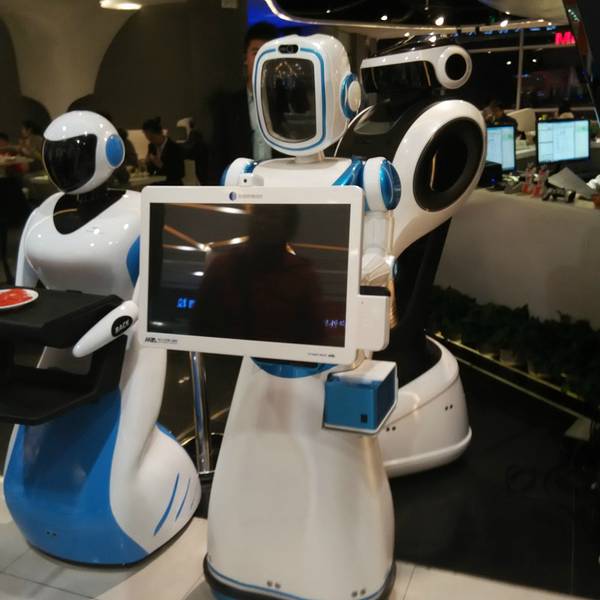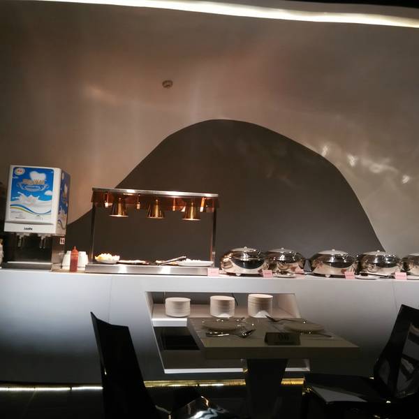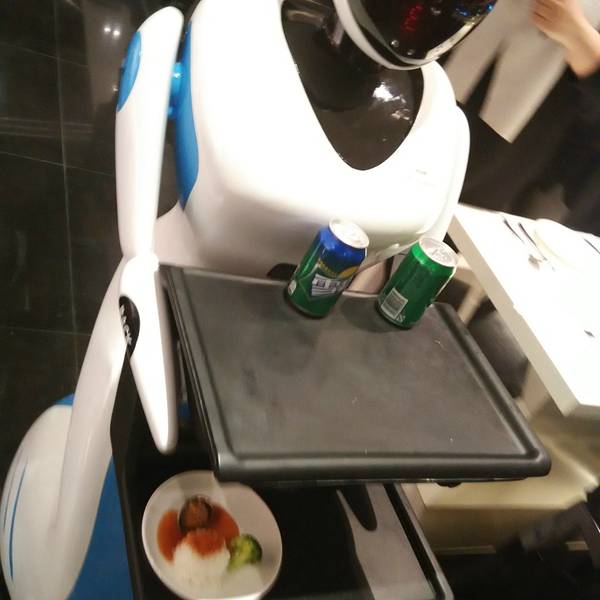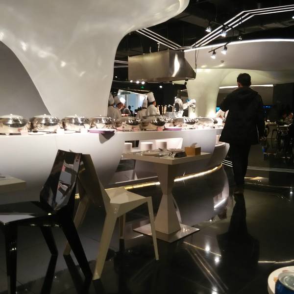 这家是机器人主题餐厅,是工大集团的一个机器人应用项目,里面很多机器人服务挺有特色的,以自助餐为主,海鲜种类还挺多的。 在顾乡的埃德蒙顿路凯德广场四楼,儿童玩具衣服那层,里面小朋友比较多。20路公交车在顾乡凯德下车就是,一般司机都知道这个商场。早上9点营业到晚上21点,因为商场21点闭店,快结束用餐之前店员会提醒。 装修风格有些现代风,很简约,颜色以白灰银色为主,干净整洁。机器人有很多,门口招揽生意的机器人,还有来回运送饮品的机器人,送餐的也是机器人,不过智能程度没那么高,需要店员输入固定桌号才能完成送餐,碰到障碍物的时候会说麻烦请让一下,只是反映有点慢,障碍需要几秒之后才能识别。每段时间还会有机器人表演,前面舞台的地方有很多小机器人跳舞,还有一个展示区,可以试着操纵简单的机器人。 服务不错,烤鸭有厨师推着推车到每桌前面现场切片,虽然热度一般,不过定制服务的感觉很舒服。店员不多,不过还比较热情周到。 价格午餐跟晚餐有20块的差额,团购价格138晚餐,感觉中午去挺好。 菜品种类不多,肉类味道还可以,感觉海鲜水分比较足,披萨放了太长的时间,表皮有些干。 寿司不错,种类很多,每种味道都还不错。 铁板区还不错,肉串跟大虾都是现做的,偶尔要排队,其实本来有一个机器人在烤串,后来觉得速度太慢就改人工的了。门口是这样的招揽生意的机器人迎宾的机器人环境是这种现代风的不过桌子有些轻薄。餐区很整洁现代风的流线线条送餐的机器人靠边的坐位景色不错,可以看到埃德蒙顿路的夜景。桌垫也有logo的限量每人一份的鲍鱼饭迷你大闸蟹,味道不好吃,又小又空,可以略过。寿司和意面烤鸭披萨放了好久各种寿司跟沙拉,鸡翅是卤制的。甜点都不好吃,糖粒没化开,味道不好。全景 总体来说是个有些噱头的地方,玩还不错,吃饭就没有什么性价比了,适合带小孩子去。