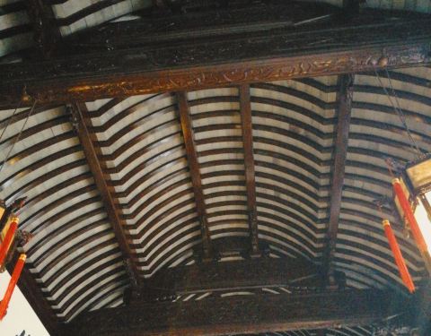 非常有设计感屋顶上的福禄寿雕像,室内鸳鸯格局,屋梁一方一圆,地面一菱形一方形,门扉一雕刻一玻璃,还有墙裙家具的不同。非常有设计感!!