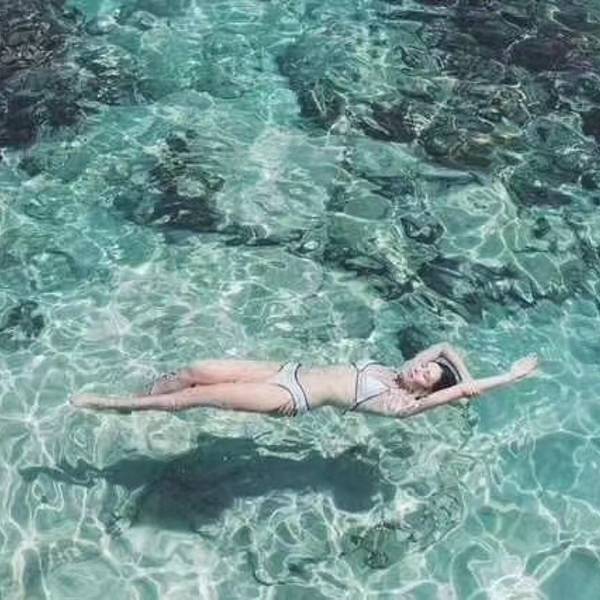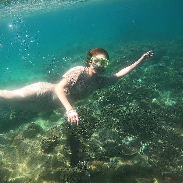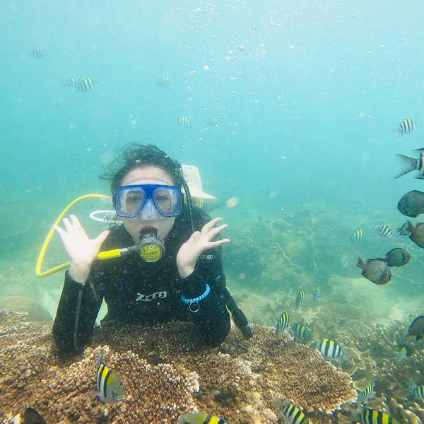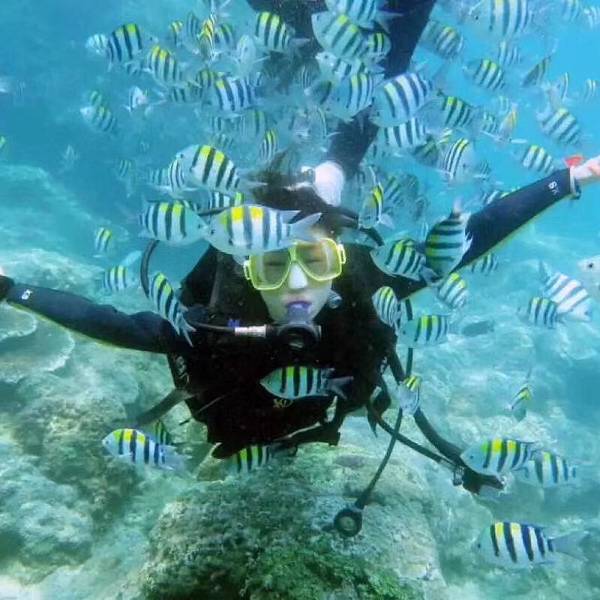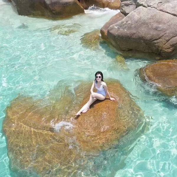 我们是从有沙滩的一边上岛的,临近沙滩的海水几乎向前延伸一百米都是清透的,并且这段海水都比较浅,甚至淹没不了膝盖,所以游客玩水的活动范围比较大,但是来这里的游客数量还是很少,所以只能见到稀稀两两的游客立在水中嬉戏,但是气氛却十分融洽美妙,大家脸上都洋溢着无比开心的笑容。我拨开裙子走向海水,脚边有崎岖多姿的珊瑚礁,还有品种多样色彩斑斓的热带鱼围着我的腿游来游去,各种各样的水生物更是看得我眼花缭乱,此时的我就像一个巨人闯入小人国一般,脚下踩的正是鱼儿们的海底花园,它们却是一点都不怕人的,丝毫不受游客们的影响,甚至还与我们互动,灵动精巧的身姿曼妙动人。