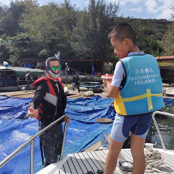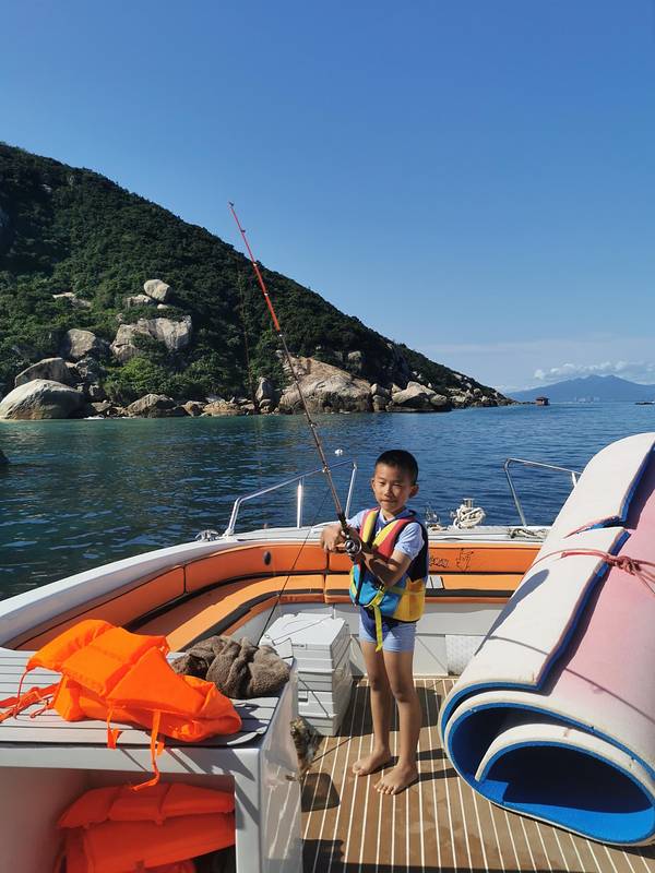 可恩钓上来三条老鼠斑鱼,这种野生的斑鱼长不大,这就是中等的了,据船长说一斤可以卖到两百多。哪天可以买个船专门来钓鱼发家致富了。后面又玩了摩托艇,海上游泳池,