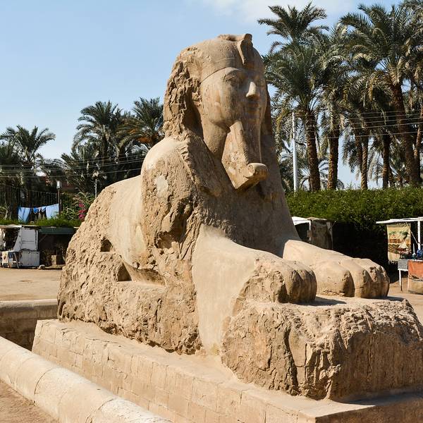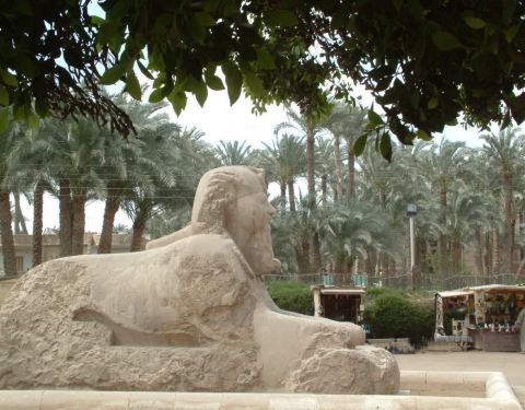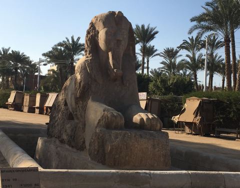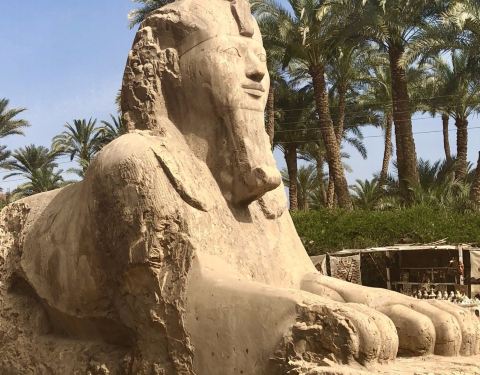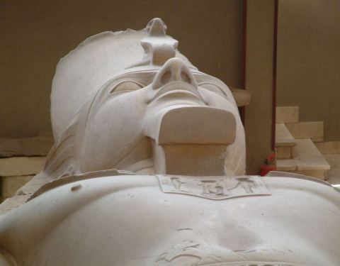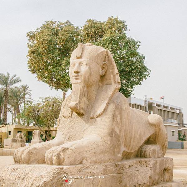 孟菲斯位于开罗市以南约32公里处,是古埃及古王国时期的首都,也是世界上古老的城市之一,但现在这里已经成了一片废墟,只剩一座露天博物馆及破败的石像了。 巨型拉美西斯二世雕像 孟菲斯博物馆十分迷你,馆内只有一座躺着的拉美西斯二世雕像。这座雕像原约14米高,由整块石灰岩雕成,相当精美。虽历经3200年的岁月,但雕像上的象形文字都还清晰可见。在一场地震中,雕像的双腿及左手折断,因此现在让雕像横躺在博物馆大厅的地上。如果要看个清楚,可以上二楼阳台绕行一圈。 阿迈诺菲斯二世狮身人面像 孟菲斯博物馆外是一片小花园,可以看到一些残破的石雕,其中一座代表阿迈诺菲斯二世(Amenphis II)的狮身人面像高4米多,由一整块80吨重的岩石雕成。