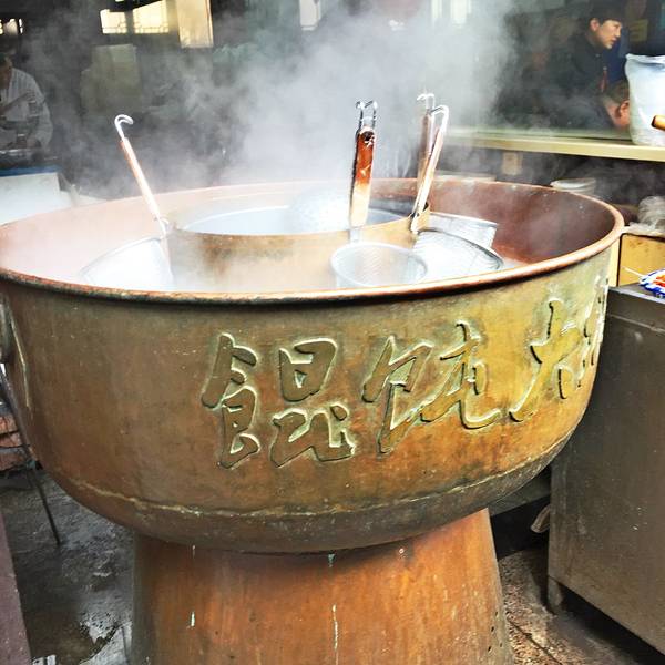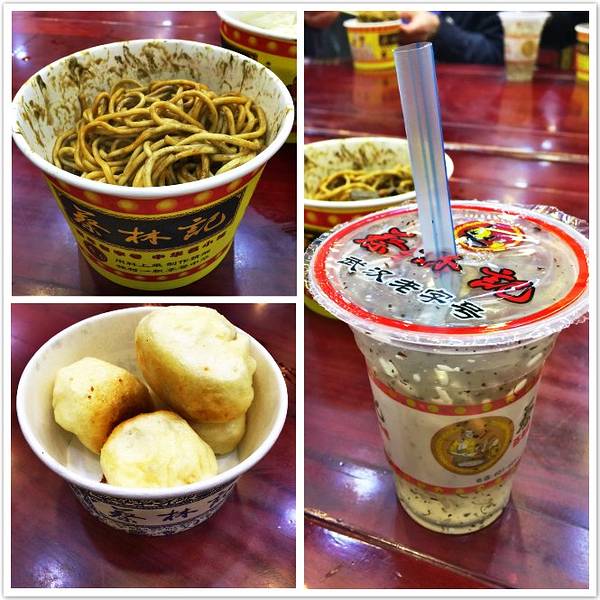 之前看游记 蔡林记那是相当的火爆 虽然是很有名的老店 但可真架不住人多排队啊 所以也没特别计划吃这家 自我安慰家家的热干面都一样 谁知道我们早上到的时候 虽然也在排队 桌子都坐满了 但是我们很幸运的占到一个大桌子 6个人妥妥的吃了一顿煮热干面火热的现场啊蔡林记的三鲜豆皮热干面的确很干。。。好像是黑芝麻酱每样试了试锅有点大哈