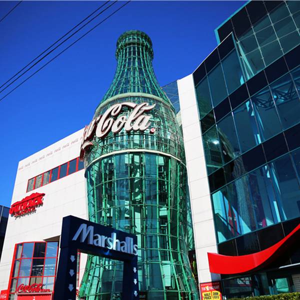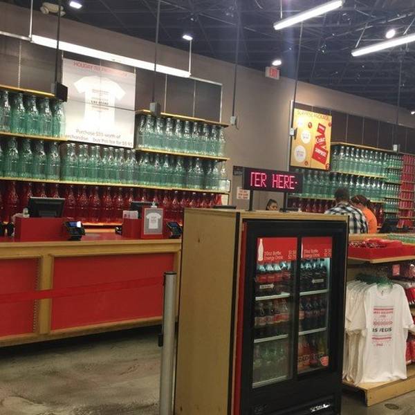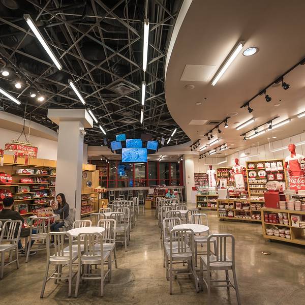 这家店造型奇特,商店内还有成百种不同样子的可口可乐玻璃杯。来到这里就像来到一座可口可乐博物馆一样
