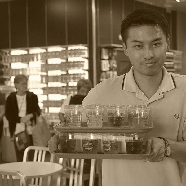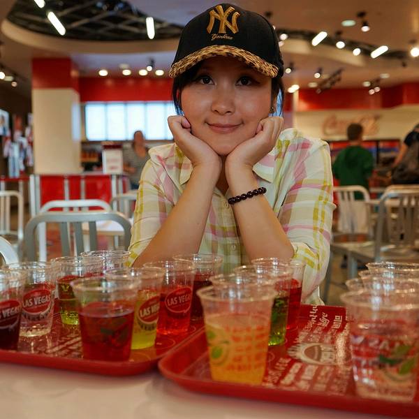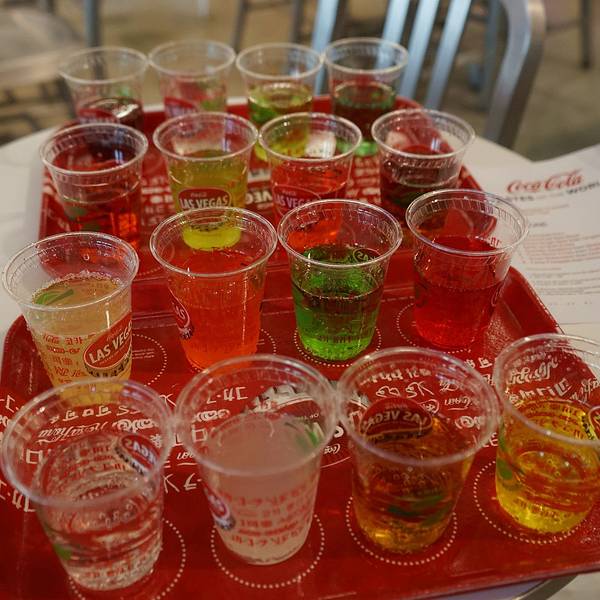 都说了是隔壁 那也不可能错过可乐商店的 这个国内似乎还没有吧一进门先直奔这只大贱熊 他在微博上有个视频 相信看过的童鞋都会被他又贱又萌的样子圈粉的 他就在一楼 专门有一块区域是跟他合影的 会有官方摄影师(照片自然是要买的 而且不便宜)也可以把相机或手机交给STAFF帮你拍然后就在货架上看到他的公仔 似乎没有本人贱 哈哈店里各种各样的LV特供瓶也是亮点 带回去自己收藏或者送小盆友都是不错滴至于他们家设计的衣服裤子 我是老板的话 又得约谈设计师了润唇膏 可乐味的润唇膏哦 因为这两天嘴唇是有点干燥 现卖现用 这也是我们买的唯一一样商品这家店的野心当然不止到此为止 他竟然还涉及了家具业 而且设计感居然还不错帽子们比衣服们好看的多 拿几顶卖个萌忽略这个2B吧 瓶盖都没拧开到了顶楼 有这家店的特色保留节目 around the world troy 带你喝遍世界 就是最左边的这一套 8刀就能喝到全世界16个国家的各种可口可乐汽水 不过老板 中国那个西瓜醒目能给我去掉吗拿到手是这个样子的 还真是诚意满满那 我们俩撑到爆也没有完全消灭他们 所以建议来周游世界的亲 在此之前少吃饭 不喝水