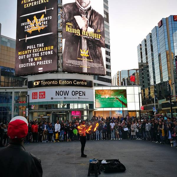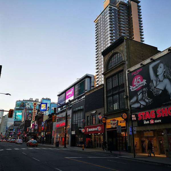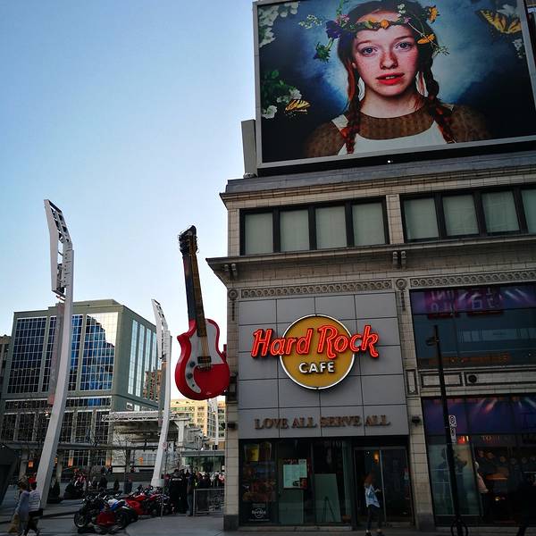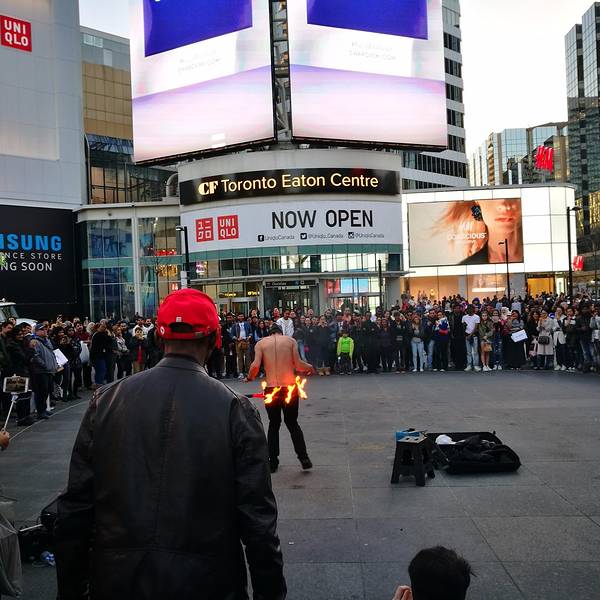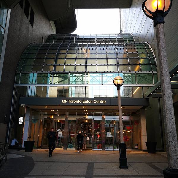 Downtown一般是指多伦多市中心,以CN Tower为核心的一片区域,这是多伦多最核心的中心区域。实话实说,Downtown寸土寸金,这里的建筑比较拥挤,高楼一栋接一栋,彼此间距极小。与此同时,多伦多似乎特别喜欢用玻璃作为整栋建筑的建筑外墙,在DOWNTOWN行走,经常会有一整栋楼的外墙反光照耀着你的眼睛,你会觉得是穿行在钢筋和玻璃融合成的小盒子中间,这种感觉并不美好。 Downtown是央街(Yonge Street)的起点,央街南起安大略湖,一直向北延伸,多伦多的Yonge Street是世界上最长的街,它南起安大略湖,一直向北穿过多伦多城区,一路上经过众多的城镇,然后在Cochrane向西,最终到达Rainy River,整条街道长1896公里,这据说是世界上最长的街道了。 Yonge在地理位置上的重要性使它成为多伦多最出名的街道,街道周围集中了许多著名的购物中心,宾馆,学校和其他许多公共设施,多伦多的地铁主干线就在Yonge街下面。 Eaton Centre是Downtown的核心区之一,这里的广场热闹非凡。一大群动物保护组织人士身着黑衣和面具,站成方阵,手中拿着电子宣传资料,不遗余力的推广着他们动物保护理念;三个东京来的日本歌手列开阵势,电吉他和架子鼓齐上阵,阵阵声浪倾泻而出,可惜听众寥寥无几;一个本地老头在往铁门上拴着一条巨大无比的狼狗,两个印度哥们在一旁看得那叫一个专注;广场那头一个长发肌肉男在表演钻火圈,边上一圈圈的都是人,看来喜欢看热闹是所有人的天性,不管你是中国人还是欧美人,这里是个移民城市,各色各样的人种凑在一起倒是丝毫不显得怪异。
