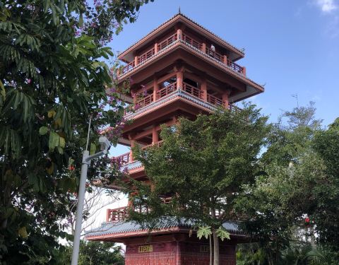 实用 临春岭公园内建有不少亭台楼阁,其中以瞭望塔的风光最为宜人,于是我们就以瞭望塔为目标,开始登山咯大树公馆的马路对面就是临春岭森林公园的正门。临春岭公园内建有不少亭台楼阁,其中以瞭望塔的风光最为宜人,于是我们就以瞭望塔为目标,开始登山咯。值得一提的是,山上没有便利店,甚至连卖矿泉水饮料的小贩都...大树公馆的马路对面就是临春岭森林公园的正门。临春岭公园内建有不少亭台楼阁,其中以瞭望塔的风光最为宜人,于是我们就以瞭望塔为目标,开始登山咯。值得一提的是,山上没有便利店,甚至连卖矿泉水饮料的小贩都没有,一定要在山下准备好饮用水再上山。随着台阶一级一级向上,大树公馆的身影越来越小,从某些角度来看还真与这山林交相辉映,融为一体。台阶两旁开满了金凤花。在三亚,一年四季都有不同的花绽放。有些“小朋友”也在登山呢,加油哥们。不出30分钟,我们就来到了瞭望塔,有五层楼高。登上塔顶,夕阳就快落“湾”了,虽然彼时能见度不高,但云雾里的三亚市区透着股迷幻般的氤氲。再看大树公馆,着实是挺让人惊叹的,真希望有朝一日它能成为三亚自豪的新城市名片。临春岭的背部山连着山,远处泛蓝的山顶就是凤凰岭海誓山盟景区了。那座山比临春岭高许多,但好在有缆车可以上山,要不然没3-4个小时爬不到山顶。瞭望塔的建筑构造虽然简单,但让人觉得很舒服,目测还是三亚本地人来的多,游客来的少。很多游客都不知道有这么个景点呢。待山风把汗水浸湿的衬衫吹干,我们也休息够了,下山咯。临春岭的美丽夕阳,与三亚湾的海上夕阳相比有别样的味道。不一样的唯美夕阳就在临春岭。 展开
