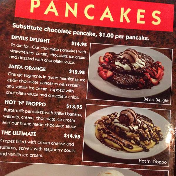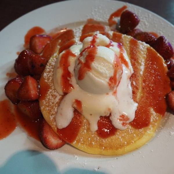 果然是国内的网红店,进去齐刷刷中国人的面孔。不过本来悉尼人口中华人比例就是高的离谱。点了网红店的网红产品牛排和Pancake。牛排和我想象的不一样,是全熟的,或者说是有点类似红烧牛排的感觉。味道其实并不惊艳,但分量足,大口吃肉的感觉还是很爽的,味道也过得去。草莓味的Pancake,这道菜倒是很好吃,Pancake异常松软,冰激凌的奶味十足,草莓的酸味正好中和了上面枫糖浆的甜味,口感很棒。这道巧克力的也不错,反正满满的卡路里,得到的是这阴雨天旅行绝对的安慰剂,一边罪恶一边爽,没几口就光盘了。