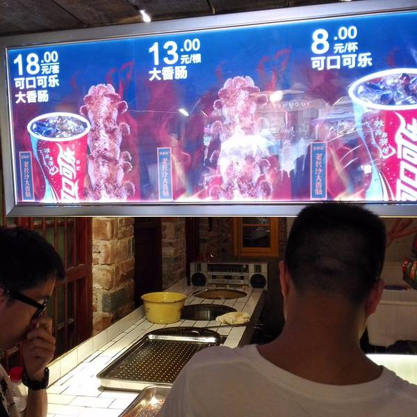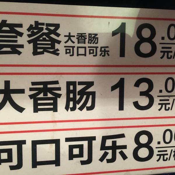 【种类、价格和口感】文和友老长沙大香肠店只卖大香肠(13元/根)和可口可乐(8元/杯),两个都要的话,就买套餐15元/套。相较于5元/根的烤肠,自然是贵的,但是口感真的不一样,老长沙大香肠是油炸出来的,炸的比较老,所以非常脆,外面涂上一层湖南辣,一个字,爽!