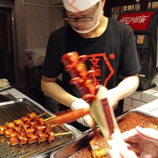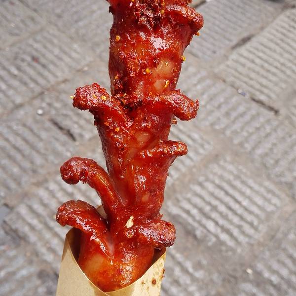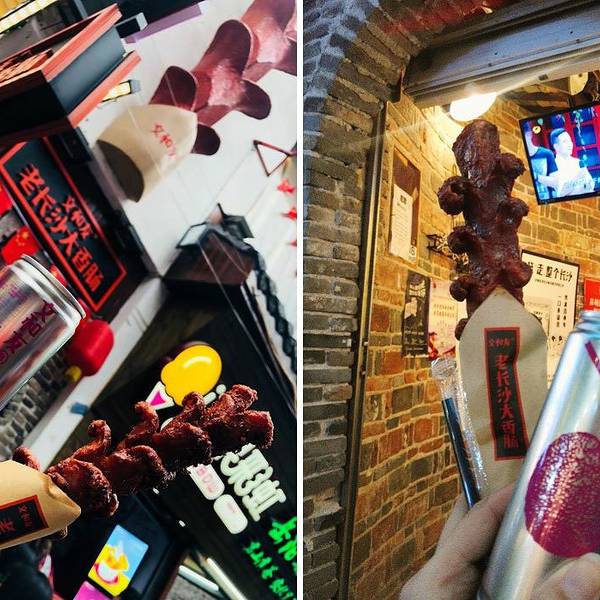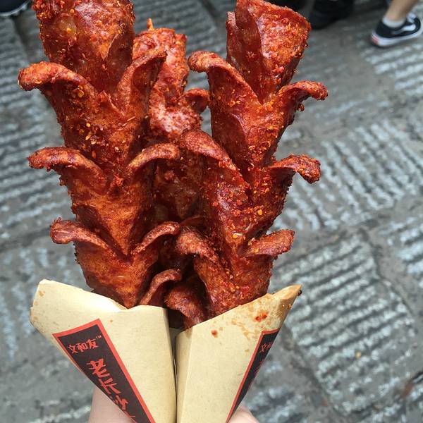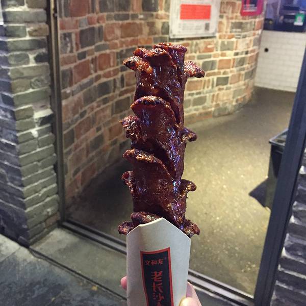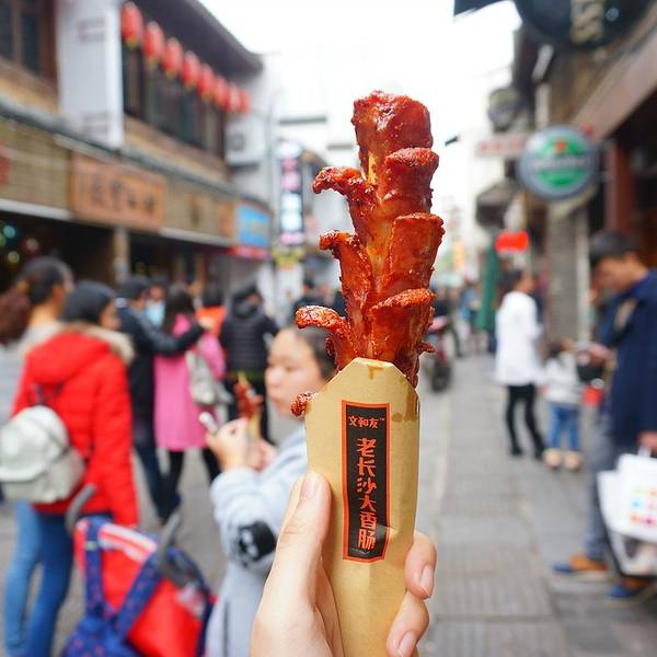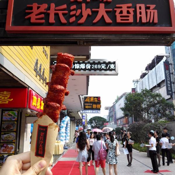 这家店位于长沙太平街上,离贾谊故居不远。店面很小,只有排一条队的空间。但是由于人气火爆,排队的人总是排到了门外面,里面卖的是又粗又长的大香肠,切了花边本身没什么奇特,炸一炸出来涂上一层厚厚的辣椒酱,加上复古的纸袋子,让人闻香出动,垂涎三尺,值得尝试。