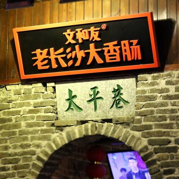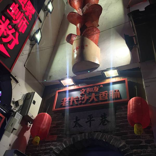 文和友老长沙大香肠 门店地址:太平街贾谊故居旁太傅里1号 大香肠:13元/根 杨梅汁:5元/罐 营业时间:10:00——23:30 离开臭豆腐门店往前走不到50米,就发现这家老长沙大香肠门店,抬头看到门头上一根巨大的香...