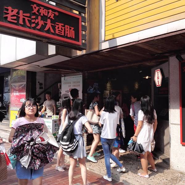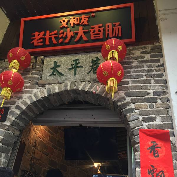 【简介】文和友老长沙大香肠属于文和友餐饮管理有限公司旗下的品牌,游客,尤其是吃货到长沙必须试吃的小吃,此外还有文和友老长沙臭豆腐、文和友老长沙油炸社和文和友老长沙龙虾馆,认准品牌哦!此外,吃货的福音:在长沙太平街内,文和友老长沙大香肠和文和友老长沙臭豆腐相距50米左右,文和友老长沙大香肠和文和友老长沙油炸社相距30米左右,是不是很给力,文和友老长沙龙虾馆有点远,但是步行10分钟也可到达。 【交通】文和友老长沙大香肠位于太平街内,交通非常方便,乘坐地铁二号线至湘江中路站下车,步行400米左右即可到达;或者乘坐2路、11路、18路、112路、138路、143路等公交车至贾谊故居站下车,步行200左右即可到达。 【店内环境】文和友老长沙大香肠店就是一个小卖铺,窄窄的巷子,一米多的收银台,里面几个帅哥在热火朝天的忙碌着,没有座位啦! 【种类、价格和口感】文和友老长沙大香肠店只卖大香肠(13元/根)和可口可乐(8元/杯),两个都要的话,就买套餐15元/套。相较于5元/根的烤肠,自然是贵的,但是口感真的不一样,老长沙大香肠是油炸出来的,炸的比较老,所以非常脆,外面涂上一层湖南辣,一个字,爽! 【周边】文和友老长沙大香肠周边最近的旅游景点是贾谊故居,友情提醒贾谊故居下午四点半就停止参观了,周一闭馆,所以我们就错过了!因为太平街已在市中心,坡子街、火宫殿等就在附近,随心逛!