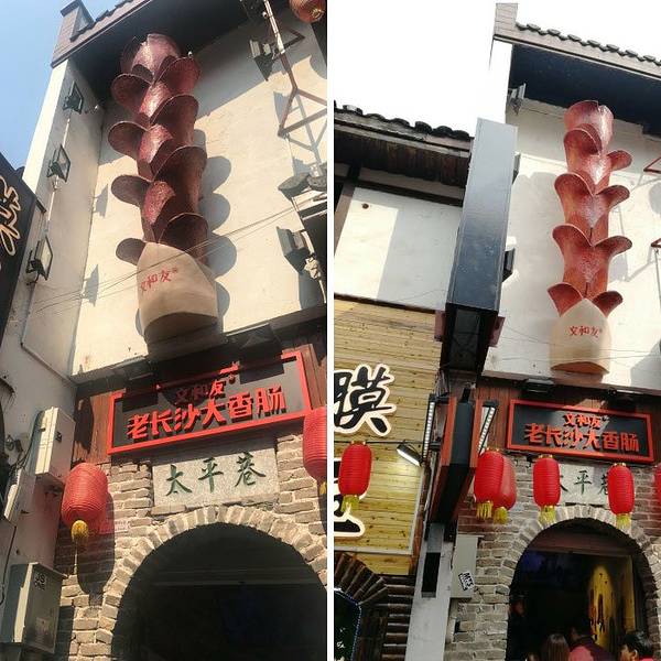 离开臭豆腐门店往前走不到50米,就发现这家老长沙大香肠门店,抬头看到门头上一根巨大的香肠模型简直感到太丧(...门店地址:太平街贾谊故居旁太傅里1号