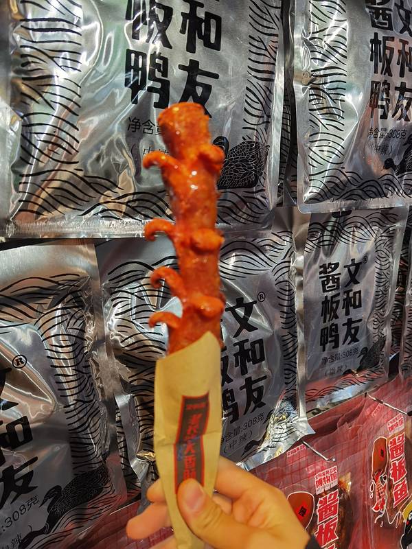 超级文和友的大香肠,13元/根还有我喜欢的草莓🍓15元/根。跟之前吃过的冰糖草莓不太一样,这个外面是麦芽糖,有一点粘牙😃酱板鸭~我们觉得一大片包装的吃起来不方便,就特意挑选了有独立小包装的罗记臭豆腐