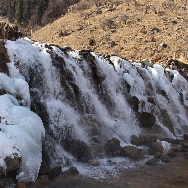 近看,水并不大,毕竟枯水期了。瀑布从高处悬下,水两侧已经结冰从磐羊湖打道回府,就经过了白龙瀑布。远远的看不见瀑布时,就能听到哗哗水声。