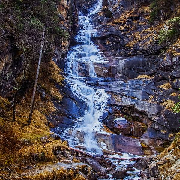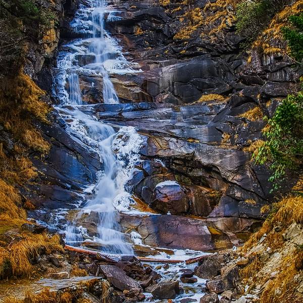 近看,水并不大,毕竟枯水期了。瀑布从高处悬下,水两侧已经结冰。想来若是夏季水盛时,整个光滑岩壁上都是有水的。