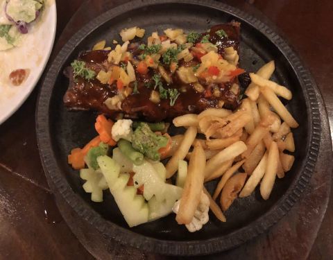 餐厅门口有绿色霓虹灯招牌所以非常醒目,店内的服务员都是侏儒,很友好,服务很周到。晚上这里还会有有歌手驻唱,享受着美妙的音乐之余点上份量十足的烤猪肋排配着鸡尾酒,让自己彻底沉醉在长滩岛的夜色中。