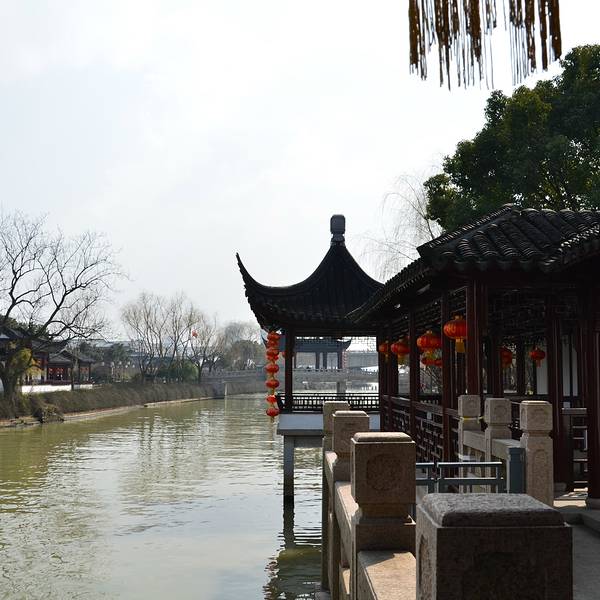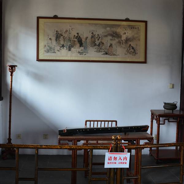 草堂背靠运河,地理位置绝佳,风景十分优美。江枫草堂是古代文人雅集的场所,柱子上的楹联有浓郁的文化氛围
