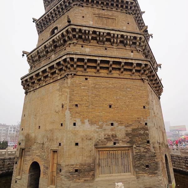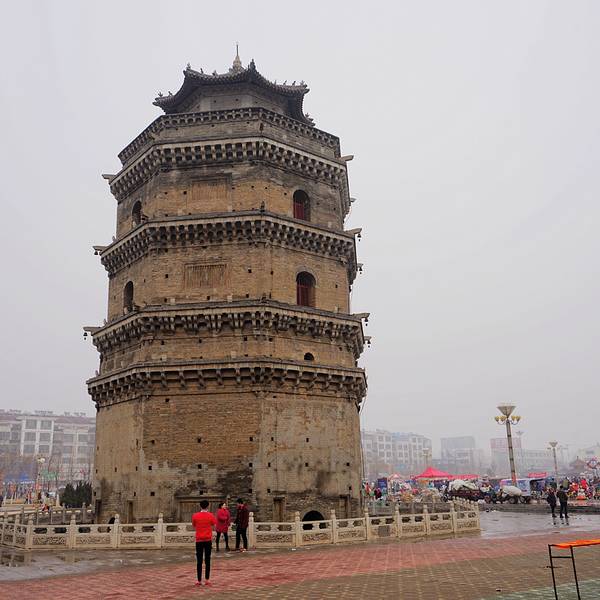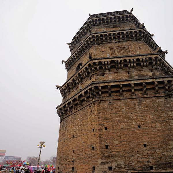 郓城荒塔,又称观音寺塔,观音寺塔为八棱四门楼阁式砖塔,现存四层,由砖雕斗拱组成塔檐。东、西、南、北四面各设一券顶坤门,其余四面为砖雕景窗。