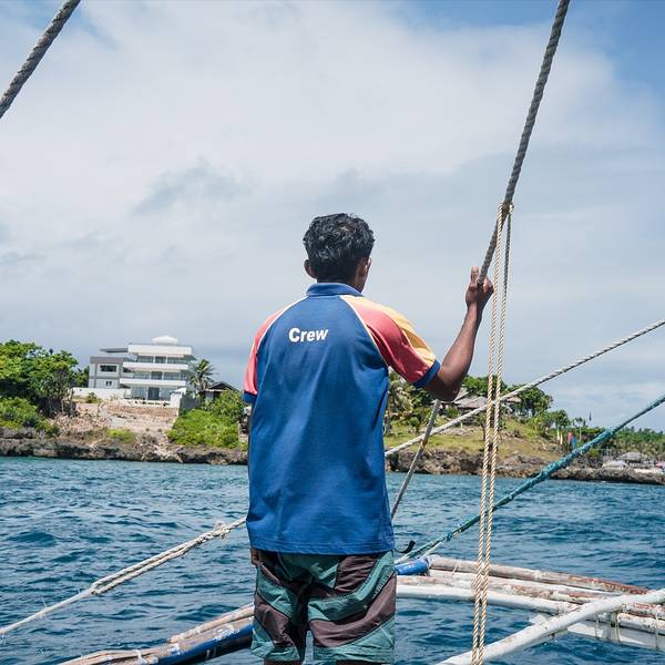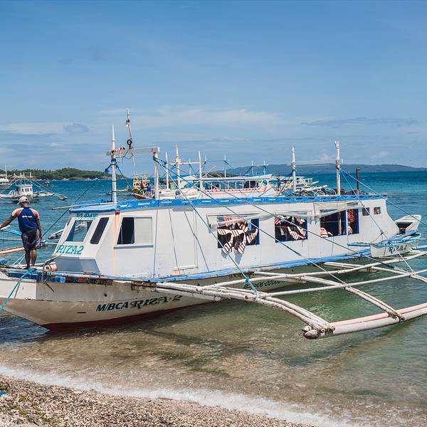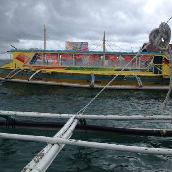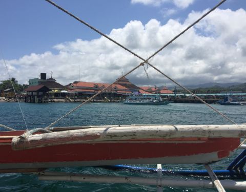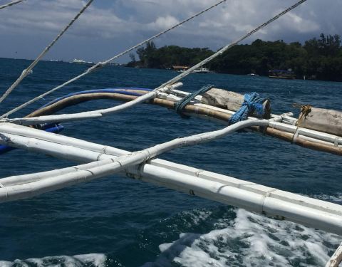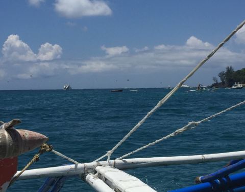 在码头买了船票,买了登岛需要的环保费之类的,都不贵,也没记录价格,码头见到持枪警备的士兵。这就是我们前往长滩岛的船,俗称螃蟹船。见到这海水,心都醉了,长滩岛的第一感觉就是水,碧海蓝天这成语就是形容这种地的。一艘船上有三四个船员,在两侧控制和观察行船情况。