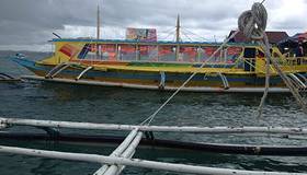 由于安排的座位并不靠窗,登机之后在飞机隆隆隆的发动机声音中我也是起飞就睡了过去,飞行过程中就没拍什么照片了。一个小时不到的飞行,到达Caticlan机场。Caticlan机场位于长滩岛南部的马雷,特别小,只能起降这种小型螺旋桨飞机和直升机,还有另外一个Kalibo卡里博国际机场(能起降大型客机)在马雷南部,距离长滩岛比较远,从Caticlan到长滩岛只需要10分钟三轮车 + 20分钟螃蟹船即可,而从Kalibo机场需要坐2个多小时的包车。我们乘坐的小飞机半身照Caticlan机场是我见过的最小的机场,比加德满都机场还小,反正下了飞机就到航站楼,进了航站楼就拿了行李,拿了行李就出门了,一个房间搞定全部。出了机场大门,在门口的三轮车售票处买了两个人的车票前往码头,70比索一人,约合人民币10块钱不到。 在码头买了船票,买了登岛需要的环保费之类的,都不贵,也没记录价格,码头见到持枪警备的士兵。这就是我们前往长滩岛的船,俗称螃蟹船。见到这海水,心都醉了,长滩岛的第一感觉就是水,碧海蓝天这成语就是形容这种地的。一艘船上有三四个船员,在两侧控制和观察行船情况。
