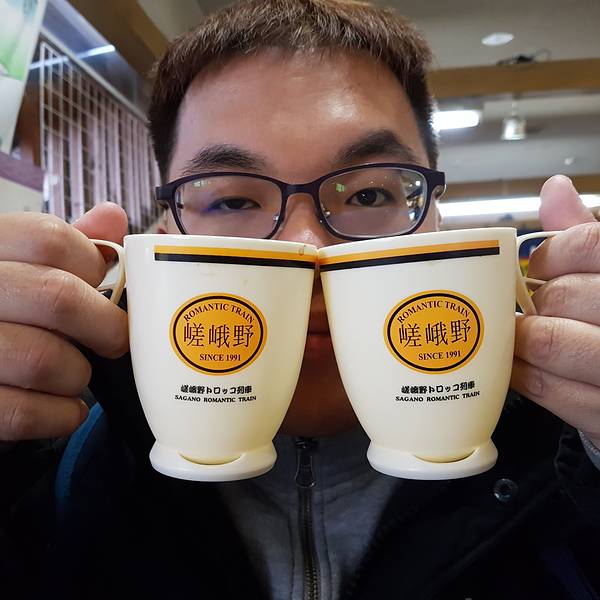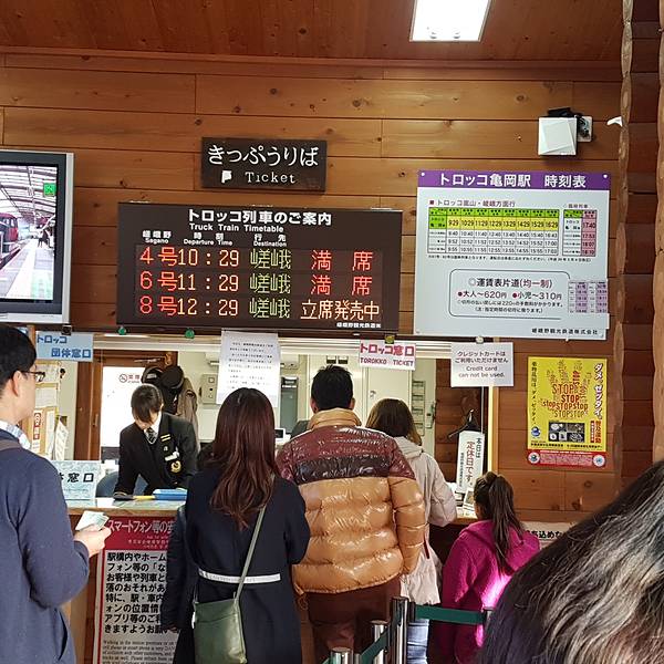 早上8點搭JR(二條駛>馬崛駛)龜岡馬掘駛9點滿滿人潮,乖乖排隊~~ 等hen久10點買到11點半的票豆皮蕎麥麵,豆皮跟麵筋一樣甜買套餐贈咖啡杯嵐山小火車來了