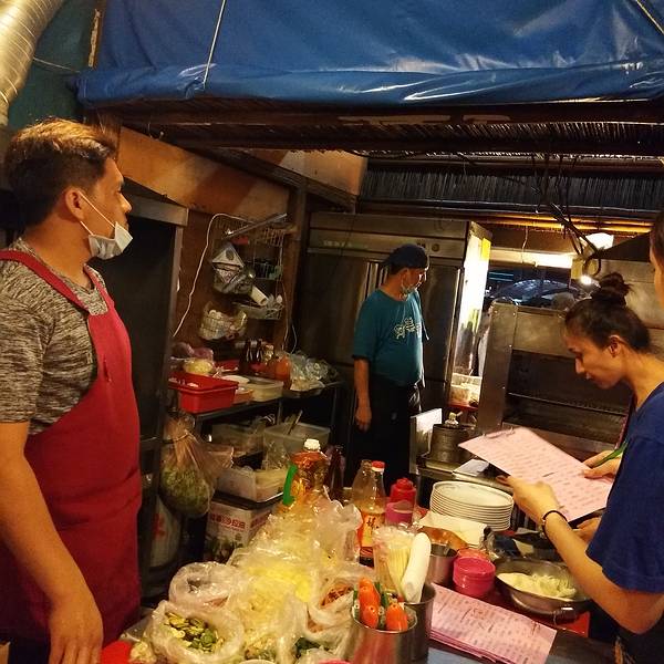 于是开始分工合作,各自排进人群队伍买东西去。一边吃一边排队,一边买一边往阿美煮走。百元热炒的店很多,我跟着感觉走选择了阿美煮,后来和一家店店主及当地居民聊天的时候,她们竟然也是推荐阿美煮。那就肯定不错吃了。