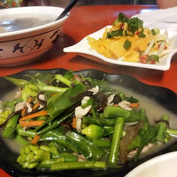 北港春卷、鸡蛋薯仔泥、地瓜球、拔丝芋头、蒋家棺财板,阿美煮的热炒:剥皮辣椒炒牛肉、炒山苏、蛤蜊汤、凉拌鱼皮......