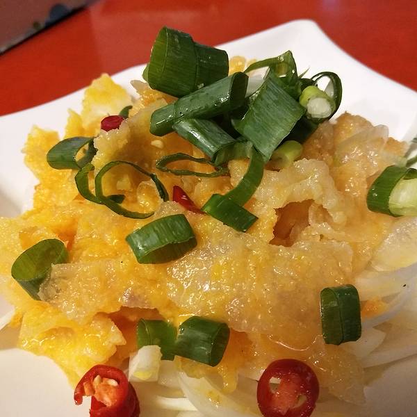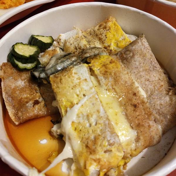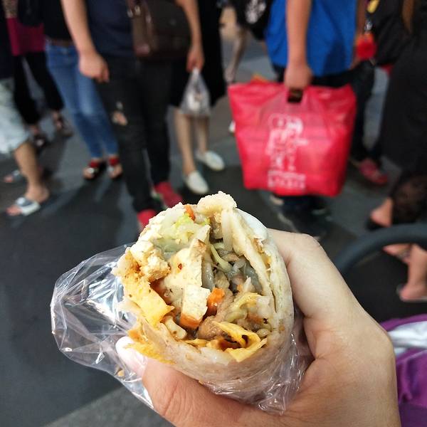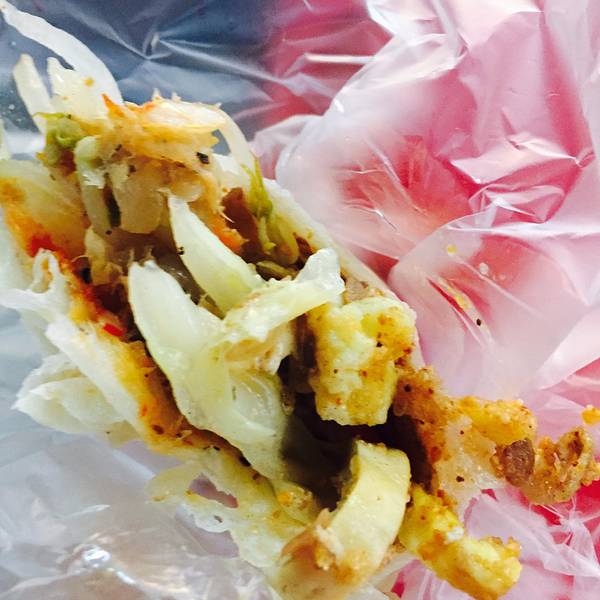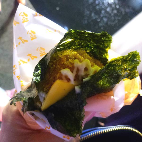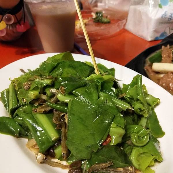如果再有机会去花莲,我一定回毫不犹豫把住处选择在夜市附近!又踩雷了!花莲的原住民一条街,也叫东大门夜市。算是花莲最繁华的街区了。东大门夜市有很多家门口摆着各式各样五颜六色的蔬菜,因为在来的路上被司机种了草,很想尝尝山苏是什么味道,于是点了一盘综合蔬菜尝尝。所谓的综合,就是几种台湾当地的特色蔬菜,炒成的一盘菜。五颜六色的,很好看。不过味道嘛。。。真的是怪怪的,略微发苦的不知道是哪个菜,有点吃不惯。这个海苔芝士饭团,很好吃。不过忘记店铺的名字了。炸蛋葱油饼,排队的食客超级多。耐着性子排了大约半个小时才等到。
