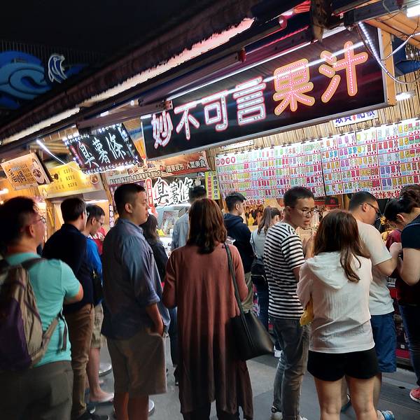 外酥里嫩的,咬一口里面的蛋黄液还会流出来,很好吃。这一家卖烤玉米的店也是超级火的。在夜市入口的第一家。支付宝在台湾九大夜市搞的“一元吃”活动真的是非常给力啊!!!扫码支付每单立减10元,大家可以去夜市里找一找。最后推荐一家非常好喝的鲜榨果汁店,果汁的口味太多啦!也是可以参加也是1元吃活动,买了一份60台币的果汁,扫码付下来只用了三块多,超合适有木有!重点是果汁也超好喝!