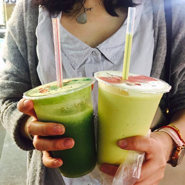 - 炸蛋葱油饼,排队的食客超级多。最后推荐一家非常好喝的鲜榨果汁店,果汁的口味太多啦!重点是果汁也超好喝