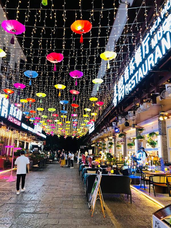 西街,有着1400多年的历史,是阳朔最古老繁华的街道,川流不息的人群已经成为了这里的标志出门去西街西街也是一条酒吧街,从入口进来西街,映入眼帘的就是各式各样的酒吧,傍晚时分还没开始营业,整条街上的气氛还是慵懒休闲的靠近入口的小酒吧还是这家小酒吧各式各样的店铺西街其实是一条很典型的商业街,贩卖的工艺品和其他大大小小的古街大同小异,所以手工艺品店我就直接略过不逛了,多欣赏欣赏两旁的风景就好街边挂着红灯笼每个古镇都有数不清的小摊卖手链耳环,在这些小摊上淘喜欢的耳环是我一大乐事傍晚时分的西街采耳作为非物质文化遗产的采耳,其实在四川、云南、广西这一带都很普遍,采耳还是很值得体验的,采完以后,会有种世界怎么这么吵的感觉灯火通明的西街入夜后的西街,餐馆、酒吧也开始营业了,歌声、吆喝声、欢呼声一片接一片,热闹非凡芒果帮二楼阳台,看风景的好地方西街的装修风格大多是中西合璧,这家芒果帮内部环境真的超赞,装修的既欧式田园又文艺复古,整个店的风车造型也是这条街上一大亮点呐喊喷泉呐喊喷泉,我来的时候刚好碰上很多人聚在这里,一起把喷泉喊到了最高,看我镜头都被溅花了ps:我也忍不住偷偷喊了一嗓子,这张图片还是有我一点功劳的很有意境的灯笼要不怎么说西街是一条典型的商业街,除了阳朔的特色小吃,全国各地只要是大家爱吃的美食,这里都有,害得选择困难症的我都不知道吃什么了让人口水直流的美食夜幕下的西街是暖黄色的,灯光亮而柔和,特别适合拍人像。吃饱喝足以后,别忘了拉着小伙伴一起拍拍拍西街