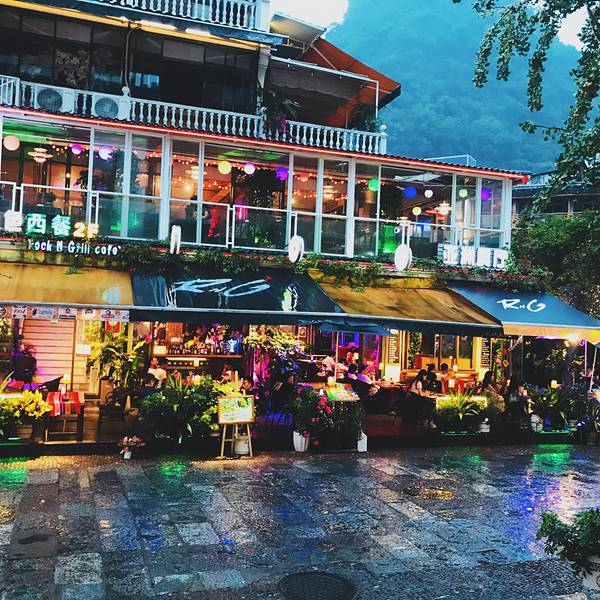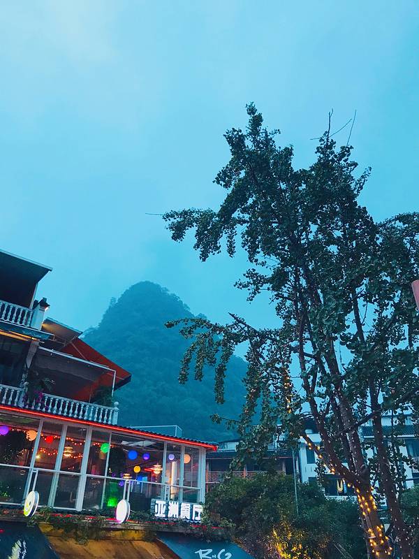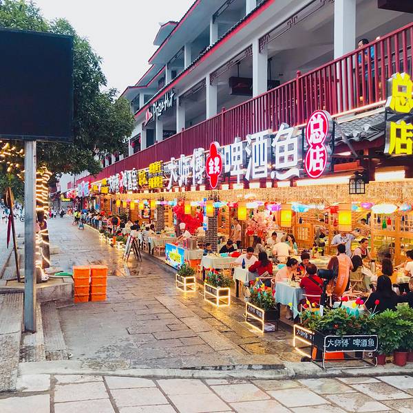 8:40出发,不到12点,就到了阳朔码头,一路途径九马画山、20元人民币背景图等景点,这些游轮上的导游都会有介绍,不用害怕错过拍照的时间。 阳朔码头到西街2公里左右,可以选择打车也可以步行。我和游轮上认识的小哥约好晚上同游西街,品尝西街美食。对于吃的我一向不是很在意,快进夜了,我和小哥逛了一圈,最终选择了阳朔的啤酒鱼作晚餐。 西街的夜是极美的,如果时间不是很赶,可以和我一样花一下午的时间休息,然后留着肚子逛西街,这里是个极其成熟的商业区,有书店、咖啡馆(星巴克)、还有许多的酒馆,一到夜里,路边招揽客人的小姐姐就都出来了,酒馆有驻唱的歌者,小桥上有卖唱的小哥,你可以选择安静的度过这个夜,也可以在喧闹的人群中选择一家酒馆坐下,认真的听歌。